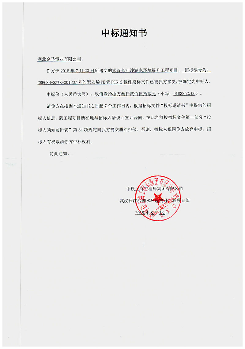 鄂州公司中標900萬元中鐵集團武漢長江沙湖水環(huán)境提升工程項目