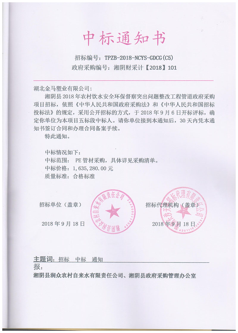 祝賀金馬塑業(yè)中標(biāo)湘陰縣2018年農(nóng)村飲水安全環(huán)保督察項(xiàng)目