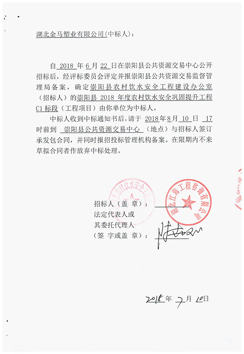 隨州祝賀金馬塑業(yè)中標崇陽縣2018年度農村飲水安全鞏固提升工程