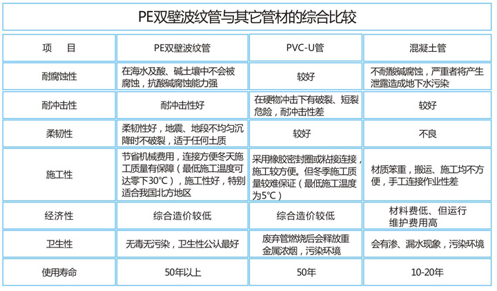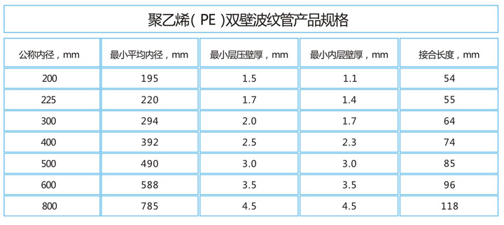 我司生產(chǎn)的HDPE雙壁波紋管材是以PE改性專用料為原料的一種新型輕質(zhì)管材,具有重量輕、耐高壓、韌性好、施工快壽命長(zhǎng)等特點(diǎn),其優(yōu)異的管壁結(jié)構(gòu)設(shè)計(jì),與其他結(jié)構(gòu)的管材相比,成本大大降低。并且由于連接方便、可靠,在國內(nèi)外得到廣泛應(yīng)用。大量替代混凝土管和鑄鐵管。 管材規(guī)格尺寸,性能符合GB/T 19472.1-2004《埋地用聚乙烯(PE)結(jié)構(gòu)壁管道系統(tǒng)第一部分:聚乙烯雙壁波紋管管材》標(biāo)準(zhǔn)的要求。彈性密封符合HG/T 3091-2000的要求。